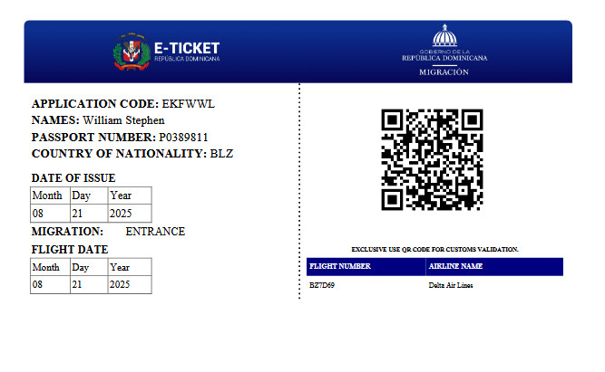 The Dominican Republic e-Ticket —also known as the eTicket República Dominicana, eTicket Dominicana, or simply the Dominican e-Ticket—is a mandatory digital form required for all travelers entering or leaving the country by air.